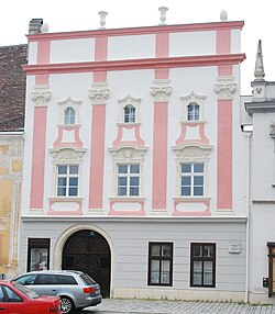 Die Fassade des Hauses aus der zweiten Hälfte des 16. Jahrhunderts ist einmal rechtwinkelig abgestuft. An der vorspringenden Fronthälfte befinden sich zwei Stuckmedaillons mit Darstellungen eines Brustbildes der heiligen Johannes Nepomuk und Josef. | BDA-Hist.: Q37953879 Status: Bescheid Stand der BDA-Liste: 2024-06-15 Name: Wohn- und Geschäftshaus, ehem. Turmhaus GstNr.: 176 Grätzl 2, Eggenburg |