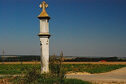 Das sogenannte Krebskreuz wurde 1829 von Johann Krebs aus Dankbarkeit für den glücklichen Ausgang eines Unfalls seiner Tochter errichtet. Die Kreuzigungsgruppe mit Postament, eingefriedet durch einen Holzzaun mit achteckigen Pfeilern, steht auf einer Plattform, die über fünf Stufen begehbar ist. Sie zeigt Jesus am Kreuz, zu seinen Füßen Maria Magdalena, links und rechts davon Maria und Johannes und dahinter, den Blick den Feldern zugewandt, den hl. Donatus mit Ährengarbe.[5] | BDA-Hist.: Q38087062 Status: § 2a Stand der BDA-Liste: 2024-06-15 Name: Figurenbildstock GstNr.: 1018/2 |