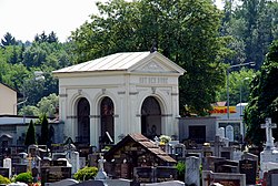 Das weiße, als Arkadengang errichtete Gebäude enthält die Gräber einer Gastwirtschafts- und Brauereibesitzerfamilie aus Deutschlandsberg. Anmerkung: Das Denkmal liegt in der südöstlichen Ecke des Friedhofsgrundstücks der EZ 94 KG 61112 Eibiswald. |