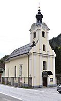 Die kleine barocke Kirche mit eingezogenem Chor und Dachreiter wurde 1744 von einer Gewerkenfamilie gestiftet und diente im 19. Jahrhundert als deren Gruftkirche. 1963/64 wurde der Bau nach Westen erweitert. Der barocke Hochaltar mit reicher Schnitzplastik und ein Votivbild stammen aus der Bauzeit.[6] | BDA-Hist.: Q37808212 Status: § 2a Stand der BDA-Liste: 2024-06-15 Name: Kath. Filialkirche St. Josef GstNr.: .168 Filialkirche St. Josef, Ferlach |