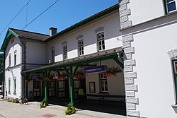 Der Bahnhof Laubenbachmühle ist Ausgangspunkt der Bergstrecke der Mariazellerbahn, der Teil im oberen Pielachtal wurde 1905 eröffnet. Das späthistoristische Aufnahmsgebäude hat zwei Seitenrisalite, der Lokschuppen weist Fachwerk auf. | BDA-Hist.: Q37946464 Status: Bescheid Stand der BDA-Liste: 2024-06-15 Name: Aufnahmsgebäude und Lokschuppen GstNr.: .473, .474 Altes Aufnahmsgebäude und Lokschuppen, Bahnhof Laubenbachmühle |