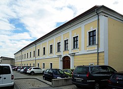 Das ehemalige Schlössel wurde in der 1. Hälfte des 18. Jahrhunderts zu einem zweigeschoßigen Barockbau mit 17 Fensterachsen umgebaut. | BDA-Hist.: Q38051427 Status: § 2a Stand der BDA-Liste: 2024-06-15 Name: Ehem. Esterhazy-Schlössel (Polytech. Schule) GstNr.: 546/1 |