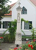 Die Statue des heiligen Josef auf einer Weinlaubsäule stammt aus dem 18. Jahrhundert. | BDA-Hist.: Q38051770 Status: § 2a Stand der BDA-Liste: 2024-06-15 Name: Josephssäule GstNr.: 369 |