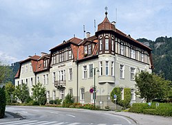 Das Bürgerhaus hat eine Giebelfassade mit altdeutschem und secessionistischem Dekor. | BDA-Hist.: Q37972876 Status: Bescheid Stand der BDA-Liste: 2024-06-15 Name: Bürgerhaus GstNr.: .40 Am Tabor 5, Frohnleiten |