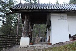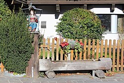 Der Brunnen besteht aus einem einfachen hölzernen Trog und einer hölzernen Säule, darauf befindet sich eine barocke Madonnenfigur aus dem 18. Jahrhundert unter einem schmiedeeisernen Dach.[18] | BDA-Hist.: Q37763776 Status: § 2a Stand der BDA-Liste: 2024-06-15 Name: Marienbrunnen GstNr.: 2124/2 |