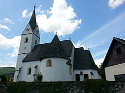 Die Pfarrkirche zum hl. Jakob ist von einem Friedhof umgeben und wurde 1245 urkundlich erwähnt. Der Chor des gotischen Baus stammt aus der 2. Hälfte des 15. Jahrhunderts, das Schiff von 1538–1539. Die Kirche war bis 1786 dem Stift St. Lambrecht inkorporiert. Sie wurde 1968–1972 restauriert. Das Relief einer bärtigen Männerfigur am Friedhofstor stammt wohl aus dem 16. Jahrhundert, daneben Marmortafeln mit den 10 Geboten vom Anfang des 17. Jahrhunderts. Der Karner ist ein zweigeschoßiger romanischer Rundbau mit einer erkerartigen Ostapsis im Obergeschoß, mit einem Rundbogenfenster, in das ein gotisches eingesetzt ist. Innen eine Kreuzigungsgruppe aus der dem 2. Viertel des 18. Jahrhunderts von Balthasar Prandtstätter. In der Kirche und im Karner sind mehrere römische Inschriftensteine aus dem 1. und 2. Jahrhundert eingemauert. |