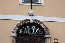 Das Portal des Pfarrhofs zeigt eine barocke, schmiedeeiserne Oberlichte. | BDA-Hist.: Q38045437 Status: § 2a Stand der BDA-Liste: 2024-06-15 Name: Pfarrhof und Wirtschaftsgebäude GstNr.: 1320 Pfarrhof Gröbming |