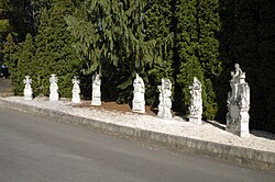 Auf einem mächtigen Sockel mit Volutenaufsatz steht die Figur des hl. Johannes Nepomuk aus dem beginnenden 18. Jahrhundert flankiert von zwei Putten. | BDA-Hist.: Q37924501 Status: § 2a Stand der BDA-Liste: 2024-06-15 Name: Figur heiliger Johannes Nepomuk GstNr.: 1160 |