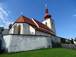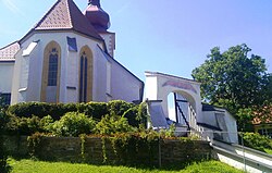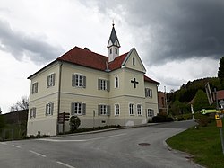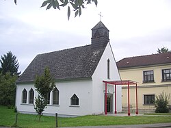 Die evangelische Kirche mit Satteldach und Giebelreiter wurde 1957 erbaut. | BDA-Hist.: Q37774854 Status: § 2a Stand der BDA-Liste: 2024-06-15 Name: Evang. Filialkirche, Evangelische Heiliggeistkirche A. B. GstNr.: 596/4 |