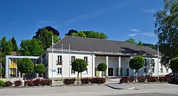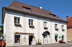 Das Rathaus in der Badgasse (Identadresse Unterer Markt 24), ein ehemaliges Eisenprovianthändlerhaus, gelangte 1850 in Gemeindebesitz. Der Bau wurde mehrfach umgestaltet, die äußere Kubatur stammt aus dem 17. Jahrhundert. Das zweigeschoßige Gebäude hat ein steiles Schopfwalmdach mit Gaupen, einen rückseitigen Erker und Sprossenfenster. | BDA-Hist.: Q37897181 Status: § 2a Stand der BDA-Liste: 2024-06-15 Name: Gemeindeamt GstNr.: .288/1 |