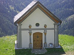Die Kapelle hoch über dem Obernbergtal stammt aus der Mitte des 18. Jahrhunderts und wurde 2006–2009 umfassend saniert. Die Kapelle mit dreiseitigem Chorschluss und geschindeltem Satteldach ist an der Giebelfassade mit Architekturmalerei versehen. Im Inneren weist sie ein Stichkappengewölbe, Stuckaturen und ein Fresko der hl. Katharina, im Apsisgewölbe eine Gottvaterdarstellung auf. Am Barockaltärchen befindet sich eine Kopie des Gnadenbildes Mariahilf.[24][25] | BDA-Hist.: Q38116473 Status: Bescheid Stand der BDA-Liste: 2024-06-15 Name: Hofkapelle beim Paulerhof GstNr.: 1236 |