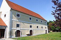 Der Schüttkasten im Westen des Meierhofs von Groß-Schweinbarth ist ein dreigeschoßiger Bau aus der zweiten Hälfte des 18. Jahrhunderts mit mächtigem Satteldach, drei Rundbogenportalen, Speicherfenstern mit Steinfaschen und einem befahrbaren Weinkeller. | BDA-Hist.: Q38075025 Status: § 2a Stand der BDA-Liste: 2024-06-15 Name: Schüttkasten GstNr.: .210 |