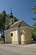 Die barocke Wegkapelle gegenüber dem Kapellenhaus stammt wahrscheinlich aus der ersten Hälfte des 18. Jahrhunderts. In ihrer Segmentbogennische befinden sich die stuckierten Reliefs Gnadenstuhl, hl. Florian und hl. Johannes Nepomuk, die ursprünglich polychromiert waren. | BDA-Hist.: Q37738094 Status: § 2a Stand der BDA-Liste: 2024-06-15 Name: Flur-/Wegkapelle GstNr.: 892/1 |