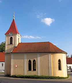 Die 1858 errichtete Ortskapelle von Zaina liegt an der Kreuzung der Ortsstraße mit der Straße nach Hausleiten. Genau genommen beginnt hier der sogenannte „Stirbweg“, der schnurgerade – vorbei am Butterkreuz – auf ca. 3,5 km nach Norden zur Pfarrkirche St. Agatha und zum Friedhof führt. Bei der Kapelle handelt es sich um einen schlichten Bau mit Halbkreisapsis und Rundbogenfenstern. An der nordöstlichen Ecke befindet sich ein Fassadenturm. Dieser Turm nimmt etwa die halbe Breite der Kapelle ein und ist mit einem Doppelpyramidenhelm bekrönt. An der Ostfront der Kapelle zeigen sich zwei Türen. Eine führt zum Turm, die andere in den Andachtsraum. Die letzte Renovierung erfolgte zur 150-Jahr-Feier im Jahre 2008. | BDA-Hist.: Q38127963 Status: § 2a Stand der BDA-Liste: 2024-06-15 Name: Ortskapelle Unbefleckte Empfängnis GstNr.: 85 |