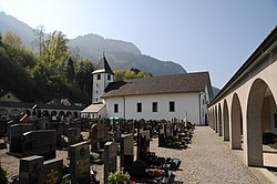 Der Friedhof wurde 1607 außerhalb des damaligen Ortsgebietes zur Bestattung der Pestopfer angelegt und 1844 auf seine heutige Größe erweitert. Er beherbergt etwa 800 Gräber und wird an drei Seiten (Nordwest, Nordost und Südost) von insgesamt 64 Arkaden begrenzt, die 1893 und 1908 errichtet wurden. Die südwestliche Abgrenzung ist eine schlichte Steinmauer. | BDA-Hist.: Q64512872 Status: § 2a Stand der BDA-Liste: 2024-06-15 Name: Friedhofsanlage GstNr.: 440/1 Kapelle hl. Sebastian und hl. Antonius - Cemetery |