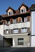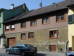 Das zweigeschoßige und dreiachsige Wohnhaus in der Harrachgasse 7, im ehemaligen jüdischen Viertel von Hohenems, stammt aus der zweiten Hälfte des 19. Jahrhunderts.[7] Im Zuge einer 2021 abgeschlossenen Sanierung entstand rechts davon ein ähnlich geschnittener Neubau, der mit dem älteren Teil über ein gemeinsames Treppenhaus verbunden wurde. Im Bestandsbau konnten die alten Holzfenster großteils erhalten werden; wo das nicht möglich war, wurden sie durch gleichartig ausgeführte Neuanfertigungen ersetzt. Das Kreuzgiebeldach wurde mit Biberschwanzziegeln eingedeckt.[8] | BDA-Hist.: Q37822402 Status: Bescheid Stand der BDA-Liste: 2024-06-15 Name: Wohnhaus GstNr.: .127 |