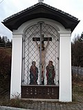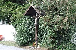 Das Wegkreuz in einem geschlossenen Bretterkasten mit einem Corpus vom Dreinageltypus stammt aus dem 19. Jahrhundert.[4] | BDA-Hist.: Q38181825 Status: § 2a Stand der BDA-Liste: 2024-06-15 Name: Kruzifix GstNr.: 970 |