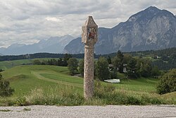 Die Schwellerkapelle ist ein gemauerter Nischenbildstock mit einem Satteldach. Sie stammt vermutlich aus dem 19. Jahrhundert. In der vergitterten Rundbogennische befindet sich eine Kreuzigungsgruppe mit spätbarockem Kruzifix.[18] | BDA-Hist.: Q37770998 Status: § 2a Stand der BDA-Liste: 2024-06-15 Name: Schwellerkapelle GstNr.: 871/1 |
