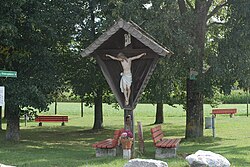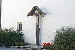 Das Hauskreuz unter einem Satteldach mit einem Corpus vom Dreinageltypus stammt aus dem 19. Jahrhundert.[3] | BDA-Hist.: Q37770997 Status: § 2a Stand der BDA-Liste: 2024-06-15 Name: Kruzifix GstNr.: .26/1 |