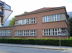 Das Städtische Hallenbad wurde 1928/29 nach Plänen von Fritz Konzert erbaut. Im Zweiten Weltkrieg beschädigt, wurde es 1981–1983 nach langen Diskussionen wiederhergestellt. Das Erscheinungsbild des funktionalen, streng sachlichen Gebäudes ist von rechten Winkeln und geraden Linien geprägt, zeigt aber auch einige vom Jugendstil beeinflusste Details. Der Bau über einem T-förmigen Grundriss besteht aus verschieden hohen Kuben und einem aus der Mitte verschobenen Treppenturm. Die Schwimmhalle weist auf drei Seiten Fenster auf, die Umkleidekabinen befinden sich auf beiden Seiten in straßenseitigen Flügeln, Foyer und Kassenhalle sowie das darüber liegende Buffet sind zentral angeordnet, die Flachdächer der einzelnen Bauteile dienen als Sonnenbadflächen. Das Hallenbad gilt als einer der bedeutendsten Bauten der 1920er Jahre und als ein Höhepunkt in der Tiroler Bäderarchitektur.[2][3] | BDA-Hist.: Q37902995 Status: Bescheid Stand der BDA-Liste: 2024-06-15 Name: Städtisches Hallenbad GstNr.: .189/3 |
