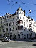 Das viergeschoßige Mietshaus wurde 1908 nach Plänen von Alois Wörle errichtet. Das Eckhaus in Formen des Heimatstils mit gotisierenden Elementen weist einen Eckturm, mehrere Erker und Mansarden in den Giebeln auf. Im Inneren befindet sich ein kreuzgewölbtes Foyer mit Pilaster- und Gurtengliederung und einem Terrazzoboden. Die freitragende galerieartige Marmortreppe im Stiegenhaus ist mit einem dekorativen Eisengeländer versehen.[23] | BDA-Hist.: Q38020833 Status: Bescheid Stand der BDA-Liste: 2024-06-15 Name: Miethaus GstNr.: .370 |