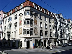 Das Eckhaus wurde 1910 im Heimatstil erbaut und ist mit Fassadenmalereien von Rafael Thaler geschmückt. Diese zeigen zwei überlebensgroße Frauendarstellungen als Personifikationen von Handel und Gewerbe, darunter Verse aus Schillers Lied von der Glocke.[21][22] | BDA-Hist.: Q37990271 Status: Bescheid Stand der BDA-Liste: 2024-06-15 Name: Wohnhaus GstNr.: .374 Pradler Straße 38 |