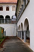Im Hof des Rathauses befinden sich dreigeschoßige Pfeilerarkaden, auf der linken Seite gotische Konsolen.[3] | BDA-Hist.: Q38045876 Status: § 2a Stand der BDA-Liste: 2024-06-15 Name: Rathaus GstNr.: .1 Rathaus Judenburg |