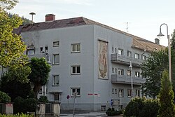 Das Wohnhaus der Gemeinde Judenburg wurde 1930/31 von Herbert Eichholzer erbaut. Das Eck wird durch Balkone und einen attikaartigen Aufsatz betont, zur Burggasse hin befindet sich ein Fresko.[2] | BDA-Hist.: Q38177774 Status: § 2a Stand der BDA-Liste: 2024-06-15 Name: Kommunaler Wohnbau, Blaues Haus GstNr.: .542, .543, .541, .540 Blaues Haus, Judenburg |
