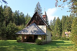 Die 1720 erbaute Kapelle mit 3/8-Schluss, großer Vorhalle und hölzernem Dachreiter beinhaltet eine hölzerne Westempore, barocke Deckengemälde, und einen Altar aus dem Jahr 1742.[4] | BDA-Hist.: Q1309089 Status: § 2a Stand der BDA-Liste: 2024-06-15 Name: Kath. Filialkirche hl. Johannes Nepomuk im (Einsiedler)Wald GstNr.: .18 Einsiedelkirche (Kötschach) |