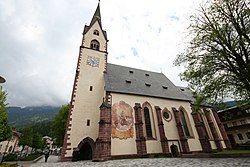 Eine Kirche wurde 1376 urkundlich genannt, doch stammt der jetzige spätgotische Kirchenbau aus dem Anfang des 16. Jahrhunderts, und wurde 1688 zur Pfarrkirche erhoben. Die Kirche hat ein spitzbogiges Westportal, einen Turm mit mächtigem Unterbau mit Schlitzöffnungen, und ein Christophorus-Fresko an der Südfassade. Einige Schnitzfiguren am Hoch- und am Seitenaltar stammen noch aus der Bauzeit der Kirche; der Hochaltar selber ist vom Ende des 18. Jahrhunderts, der neobarocke Seitenaltar von 1871. Die neugotische Orgel von 1914 stammt von Alois Fuetsch.[10] | BDA-Hist.: Q20754117 Status: § 2a Stand der BDA-Liste: 2024-06-15 Name: Kath. Pfarrkirche hl. Jakob und Friedhof GstNr.: .24 Pfarrkirche St. Jakob im Lesachtal |
