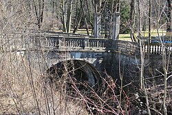 Brücke über den Kaumbergbach, gemauert unterwölbt mit Quaderverblendung, bezeichnet 1890, neobarocke Steinbalustrade und Portalpfeiler mit ornamentalem Schiedeeisentor | BDA-Hist.: Q38126025 Status: § 2a Stand der BDA-Liste: 2024-06-15 Name: Straßenbrücke GstNr.: 574/1 |
