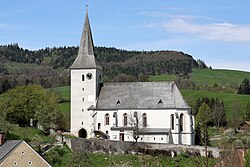 | Südansicht der röm.-kath. Pfarrkirche hl. Michael in der niederösterreichischen Marktgemeinde Kaumberg . Eine in erhöhter Lage in mehreren Bauetappen errichtet gotische Saalkirche mit einem mächtigen spätgotischen Westturm (mit 1502 datiert) und die teilweise von einer Wehrmauer umgeben ist. | Eigenes Werk | C.Stadler/Bwag | Datei:Kaumberg Kirche2.JPG | |