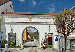 | Die klassizistische Portalanlage stammt aus dem Ende des 18. Jahrhunderts und bildet die Einfahrt zur Schlossallee. Auf den Seiten zwei Steinfiguren, oben das Wappen der Inzaghi. Kindberg, Steiermark. | Eigenes Werk | Herzi Pinki | Datei:Gartenportal Kindberg 02.jpg | |