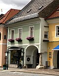 Das Wohnhaus stammt aus der Wende vom 16. zum 17. Jahrhundert. Eine Rundsäule stützt das überhängende Obergeschoß. | BDA-Hist.: Q38181845 Status: Bescheid Stand der BDA-Liste: 2024-06-15 Name: Bürgerhaus GstNr.: .23 Bürgerhaus Hauptstraße 74, Kindberg |