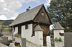 Das kleine, in die Friedhofsummauerung eingefügte zweigeschoßige Wirtschaftsgebäude mit holzschindelgedecktem Satteldach stammt im Kern aus dem Ende des 15. Jahrhunderts. Das Fundament und die Pfeiler im Erdgeschoß sind gemauert, der Rest ist in Ständerbauweise mit Bretterverschalung gezimmert. Das Obergeschoß ist zusätzlich an der westlichen Traufseite verputzt.[11] | BDA-Hist.: Q37756534 Status: § 2a Stand der BDA-Liste: 2024-06-15 Name: Zimmerhütte GstNr.: 1 |