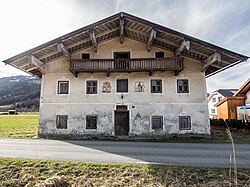 Der nach dem Dorfbrand 1809 neu errichtete Einhof im Ortszentrum dient seit 1993 als Heimatmuseum. Das gemauerte Erdgeschoß weist gemalte Pilaster an den Kanten und gemalte Fensterrahmungen auf, an der Stirnseite befindet sich eine Mariahilfdarstellung und an der Südseite der Erzengel Michael. Das in Kantblockbauweise gezimmerte Obergeschoß ist auf drei Seiten mit einem umlaufenden Söller umgeben. kleiner Giebelsöller. Das flache Satteldach wird von einem Giebelkreuz und einem Glockenturm bekrönt.[12] | BDA-Hist.: Q37951799 Status: § 57-Mandatsbescheid Stand der BDA-Liste: 2024-06-15 Name: Bauernhaus, Museum Metzgerhof GstNr.: .20 |