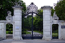Die Einfriedungsmauer des heutigen Schlossparks entstand nach 1901 aus verputztem Bruchsteinmauerwerk. Das Haupttor in der östlichen Umfassungsmauer weist eine mittige Einfahrt zwischen zwei hohen verkröpften und vernuteten Pfeilern mit Vasenaufsätzen und seitlichen, niedrigeren volutenförmigen Halbgiebeln auf. Auf diesen sitzen Löwenstatuen. Auf beiden Seiten der Einfahrt sind schulterbogenförmige Durchgangsöffnungen. Das zweiflügelige Schmiedeeisentor für die Haupteinfahrt stammt von der Kunstschmiede Marton und Söhne und wurde ursprünglich für den österreichisch-ungarischen Pavillon auf der Weltausstellung 1900 in Paris gefertigt.[3] | BDA-Hist.: Q38053157 Status: § 2a Stand der BDA-Liste: 2024-06-15 Name: Zwei Gartenportale GstNr.: 1/3 Gartenportal (Kittsee) |