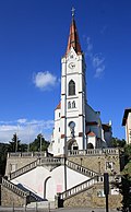 Markant an dieser in den Jahren 1910 bis 1914 erbauten neoromanischen Pfarr- und Wallfahrtskirche ist der mächtige vorangestellte Südwestturm. | BDA-Hist.: Q2082379 Status: § 2a Stand der BDA-Liste: 2024-06-15 Name: Wallfahrtskirche Maria Königin der Engel, Maria Gugging GstNr.: 1/5 Pfarr- und Wallfahrtskirche Maria Gugging |