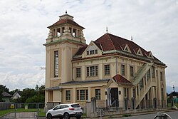 Das Umspannwerk stammt aus dem Jahr 1925 von Leopold Steinitz. Nach Achleitner weist es Anleihen beim Expressionismus und Kubismus und keine konventionellen stilistischen Bezüge auf.[2] Mit seinem Eckturm und der Außentreppe lehnt es sich am ehesten an das Schema des Schlossbaus an.[3] | BDA-Hist.: Q112943866 Status: Bescheid Stand der BDA-Liste: 2024-06-15 Name: Umspannwerk GstNr.: 826/2 Umspannwerk Knittelfeld |