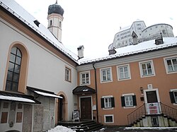 | Dreifaltigkeitskirche mit Krypta (Totengruft), auf Pfarrplatz Nr. 2 der Pfarrhof und auf Nr. 3 das ehemalige Mesnerhaus. | Eigenes Werk | Erich Schmid | Datei:Dreifaltigkeitskirche und Widum Kufstein.JPG |