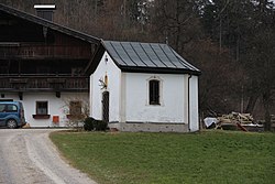 Die einjochige gemauerte Hofkapelle mit rundem, leicht eingezogenem Chorschluss und Satteldach wurde 1972 erbaut. Die Fassaden sind durch farblich abgesetzte Lisenen an den Gebäudekanten gegliedert. Im Inneren ist die Decke leicht segmentbogig gewölbt.[34] Zwischen der Kapelle und dem Hof steht ein Kruzifix vom Ende des 19. Jahrhunderts mit Corpus im Viernageltypus.[35] | BDA-Hist.: Q37807688 Status: § 2a Stand der BDA-Liste: 2024-06-15 Name: Hubertuskapelle beim Marchhof / Marchkapelle und Kruzifix GstNr.: 409 Marchhof und Hubertuskapelle (Kufstein) |