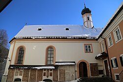 Die Spitalskirche St. Vincencia wurde 1869 geweiht. Ihr Abriss wurde vom Bundesdenkmalamt am 16. August 2006 genehmigt unter der Auflage, dass die Apsis und das Wandgemälde des bayerischen Malers Johann Baptist Müller restauriert und in der auf dem Friedhof neu errichteten Kirche wieder angebracht werden.[39][40] 2013 erfolgte die Weihe der neuen Kirche.[41] Die Werke Müllers wurden an ihrem neuen Platz in der Friedhofskirche erneut unter Denkmalschutz gestellt. | BDA-Hist.: Q106704988 Status: Bescheid Stand der BDA-Liste: 2012-06-06 Name: Spitalskapelle St. Vincencia, hl. Geist GstNr.: 50/1 Spitalskapelle St. Vincencia, Kufstein |