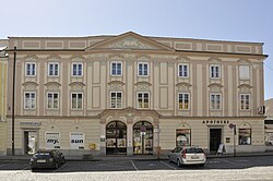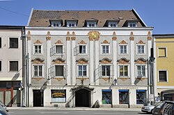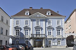 Die Besitzverhältnisse des Prausenhauses sind bis ins Jahr 1660 belegt, wobei das platzseitig achtachsige Gebäude mit zwei Obergeschoßen und Attika mit einer Architektur aus der Zeit um 1730 bis 1740 ausgestattet ist. | BDA-Hist.: Q37978592 Status: Bescheid Stand der BDA-Liste: 2024-06-15 Name: Prausenhaus, Apothekerhaus GstNr.: .20 |