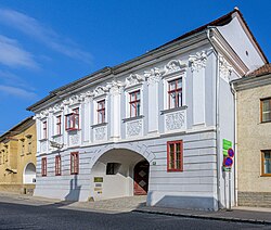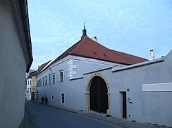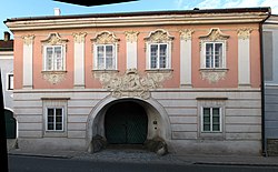 Der ehemalige Altenburger Stiftshof ist ein zweigeschoßiger, traufständiger Bau mit steilem Walmdach, Gesims- und Pilastergliederung und Rustikallisenen im Sockelgeschoß, der um die Mitte des 18. Jahrhunderts errichtet wurde und über einen Baukern aus dem 16. Jahrhundert verfügt. Straßenseitig ist ein mit 1677 bezeichnetes, gemaltes Medaillon zu sehen. Der barock geschwungene Torgiebel verfügt über Obelisken und ein reliefiertes Wappen des Stiftes Altenburg. | BDA-Hist.: Q37963634 Status: Bescheid Stand der BDA-Liste: 2024-06-15 Name: Altenburger Stiftshof, ehem. Zehenthof GstNr.: 401/2 Altenburger Stiftshof, Langenlois |