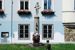 Der im 17. Jahrhundert errichtete Pranger auf dem Marktplatz verfügt über einen abgefasten Pfeiler mit Obelisk auf Rundbasis. Auf der Sockelinschrift ist zu lesen: 1583 Verleihung d. Marktrechtes u. d. nied. Gerichtsbarkeit. | BDA-Hist.: Q38148262 Status: Bescheid Stand der BDA-Liste: 2024-06-15 Name: Pranger GstNr.: 2098/19 |
