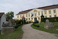 Der Gutshof wurde 1725 zu einem herrschaftlichen Schloss ausgebaut. 1740 erwarb das Stift Zwettl das Schloss. In der Schlosskapelle befinden sich ein Deckengemälde mit der Darstellung Mariens und ein Seitenaltarbild mit der Darstellung des Hl. Bernhard des Kremser Schmidt von 1769.[3] Bis in die 1990er Jahre befand sich im Schloss eine Außenstelle des Österreichischen Museums für Volkskunde. Schloss Gobelsburg ist Sitz des Weinguts Schloss Gobelsburg. | BDA-Hist.: Q2241219 Status: § 2a Stand der BDA-Liste: 2024-06-15 Name: Schloss Gobelsburg GstNr.: .26/1, .26/2, 47, 158 Schloss Gobelsburg |