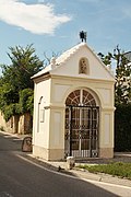 Giebelbau mit barockem Schmiedeeisengitter und polychromierten Stuck-Reliefs aus dem 18. Jahrhundert | BDA-Hist.: Q37759890 Status: § 2a Stand der BDA-Liste: 2024-06-15 Name: Mariazellerkapelle/ Pestkapelle GstNr.: 173 Mariazellerkapelle, Laxenburg |