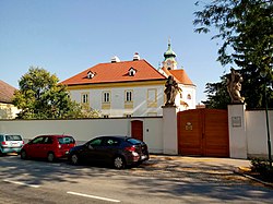Zweigeschoßiger Bau mit Walmdach aus dem 17. Jahrhundert, 1760 bis 1773 umgebaut | BDA-Hist.: Q38038207 Status: § 2a Stand der BDA-Liste: 2024-06-15 Name: Pfarrhof mit Ummauerung samt Skulpturenschmuck GstNr.: 224, 223 Laxenburg Rectory |