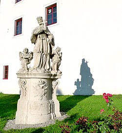 Die Statue des hl. Johannes Nepomuk bei der Schlosseinfahrt stammt aus dem Jahr 1729. | BDA-Hist.: Q38097475 Status: Bescheid Stand der BDA-Liste: 2024-06-15 Name: Figurenbildstock hl. Johannes Nepomuk GstNr.: 150/2 |