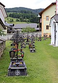 | Teilansicht des Kirchhofes/Friedhofes der Salzburger Gemeinde Lessach . Eine Besonderheit ist, dass die Gräber einheitlich mit schwarz und silber bemalten Holzrahmen eingefasst und mit schmiedeeisernen Kreuzen geschmückt sind. Damit wird sichtbar gemacht, dass im Tod alle gleich sind. | Eigenes Werk | C.Stadler/Bwag | Datei:Lessach - Kirchhof.JPG | |